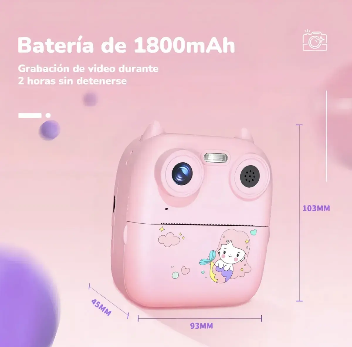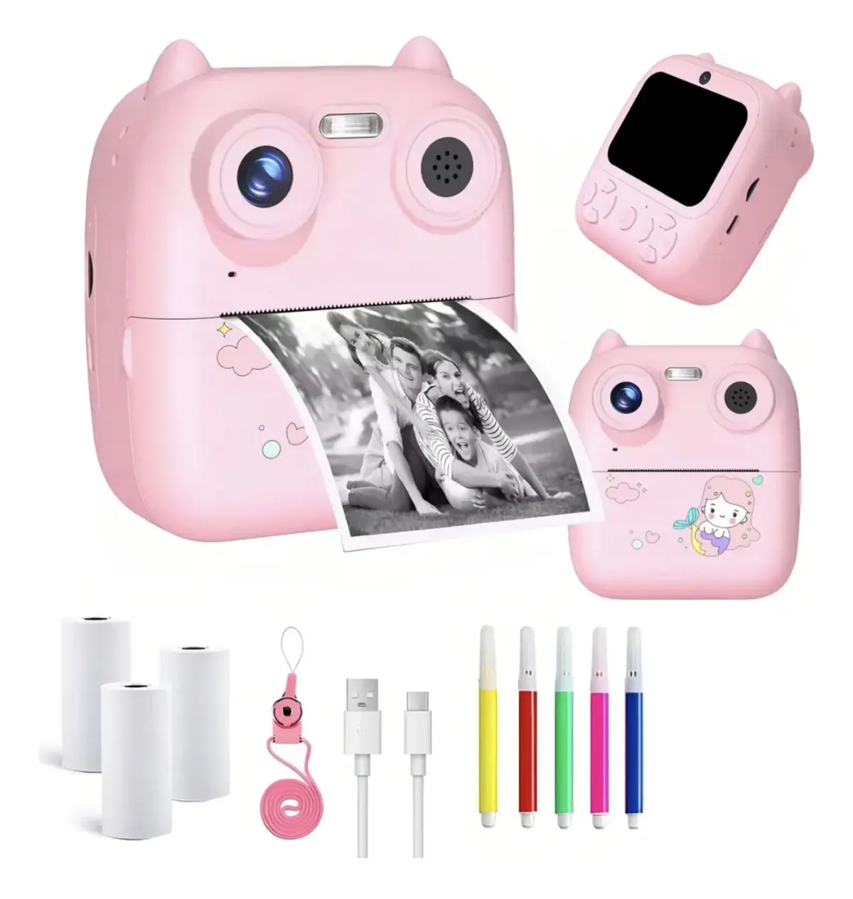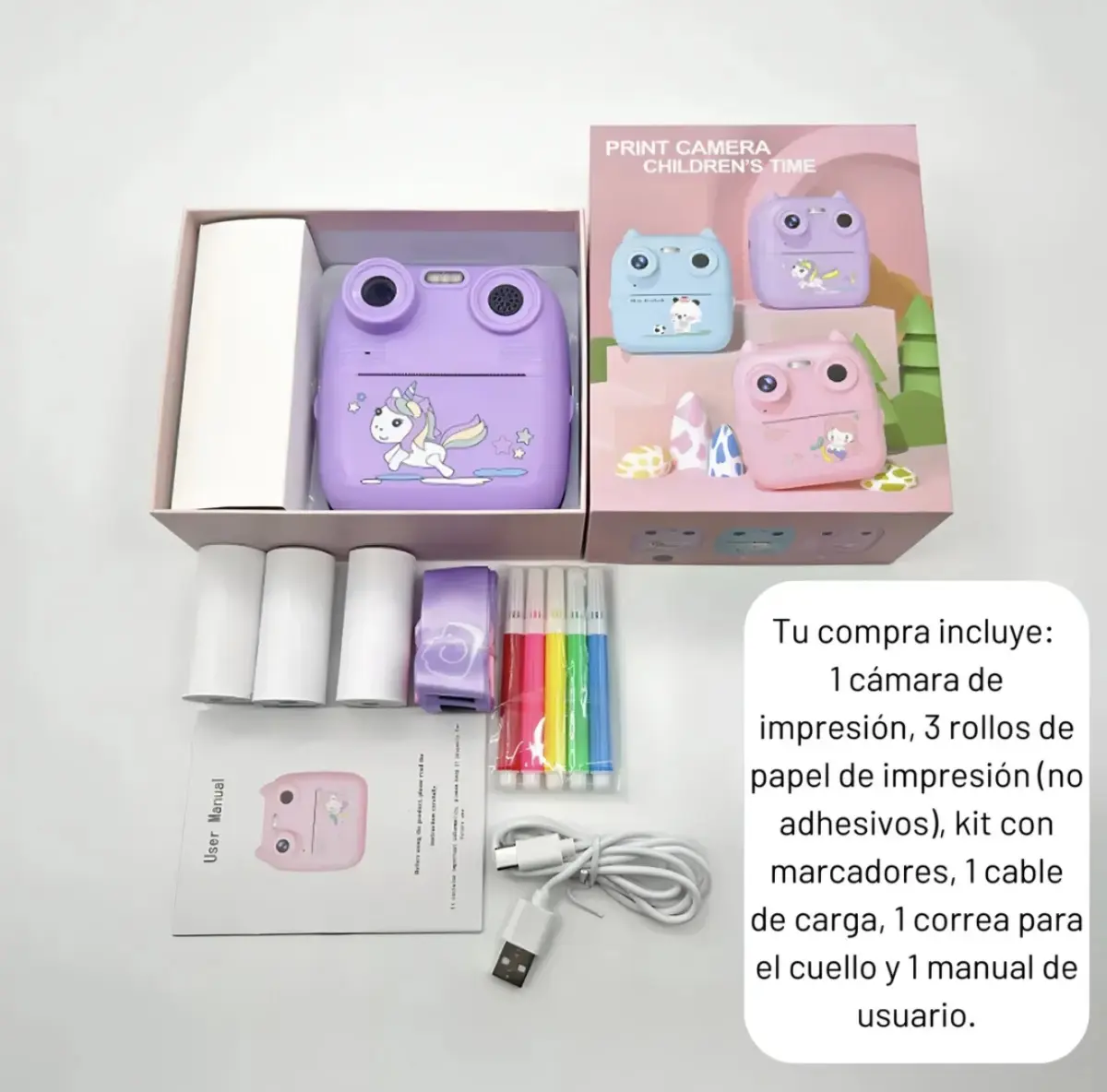 1 cámara de impresión para niños con 10 cm de alto x 9,5 cm de ancho X 4 cm de profundidad, 3 rollos de papel de impresión, kit con marcadores, 1 cable de carga, 1 correa para el cuello y 1 manual de usuario.